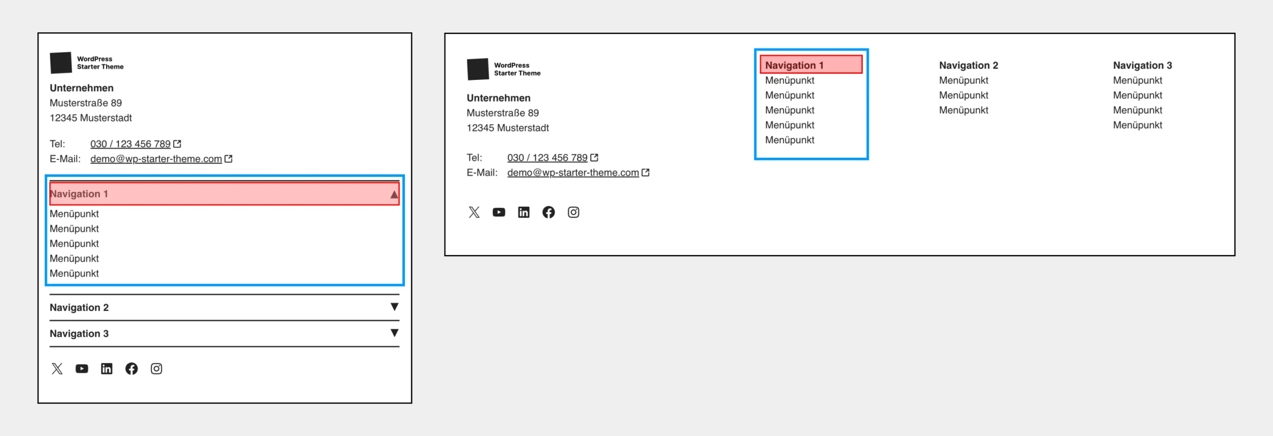 Die Navigationsbereiche im Footer verwandeln sich – je nach Pattern – auf kleinen Viewports in Accordions. Das Verhalten wird aktiviert, wenn folgende Voraussetzungen erfüllt sind: