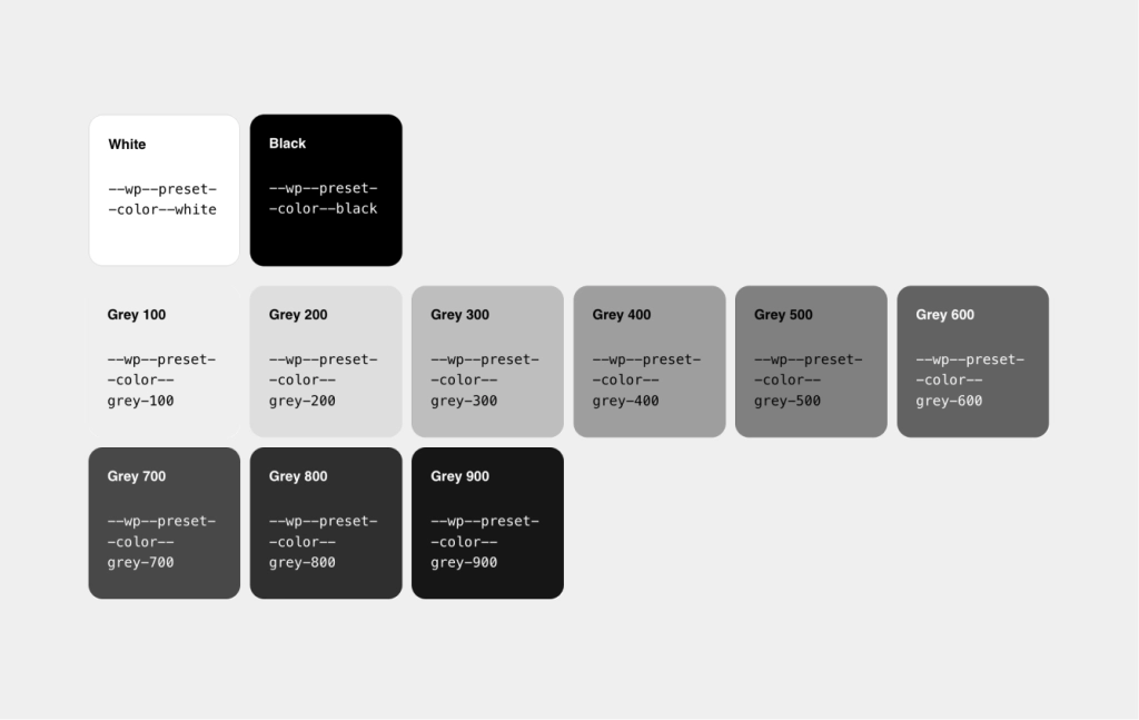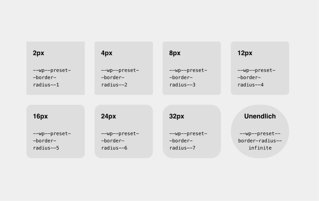 Wir haben acht verschiedene Stile für abgerundete Ecken vorbereitet, die zentral in der theme.json angepasst werden können. In Kombination mit der Spacing-Hierarchie (siehe Raster) können Elemente mehrfach verschachtelt werden und bilden harmonische Kombinationen.