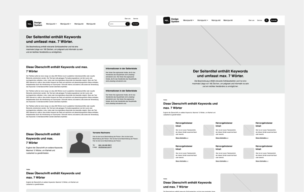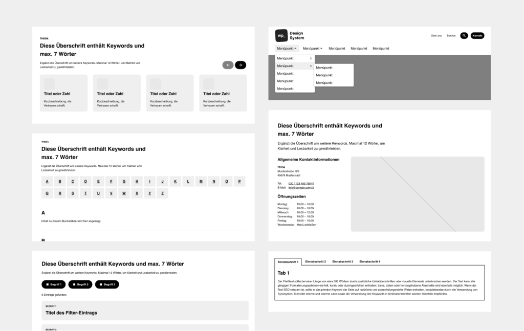 Unser Design System beinhaltet weit über 150 Patterns, die dem Purpose First-Ansatz folgend, bestimmte konzeptionelle Situationen im Layout bedienen. Die Pattern sind vollständig mit dem Block Editor gebaut und kombinieren Layout und Content-Outline, damit sinnvolle, suchmaschinenoptimiere und barrierefreie Texte schnell integriert werden können.